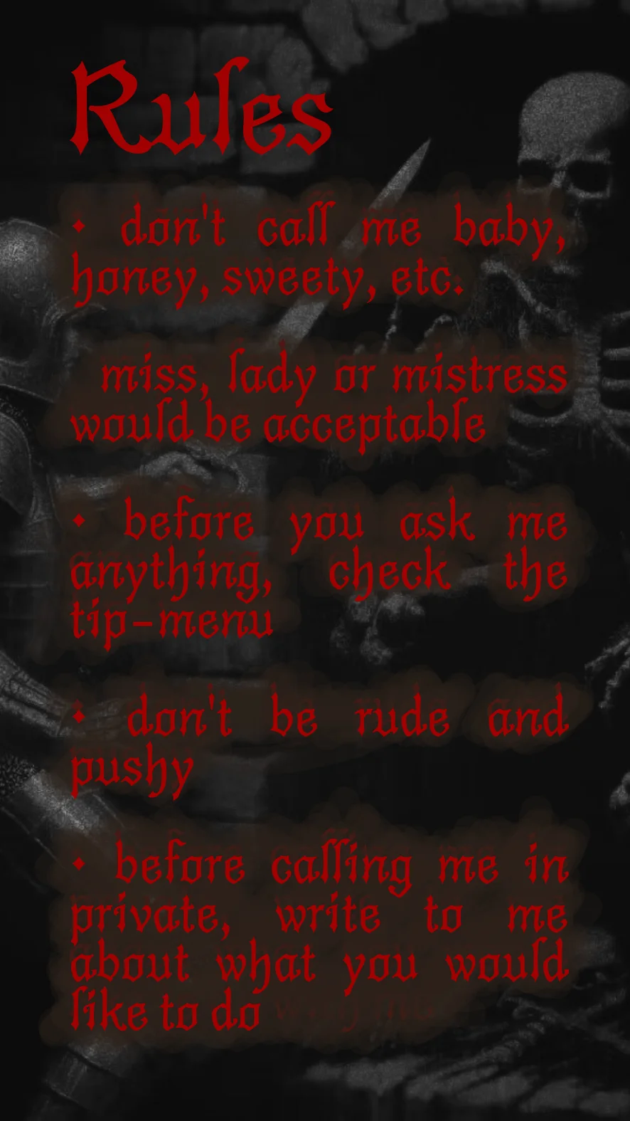 To please me and to get what deserve you must be respectful, loyal and generous. I appreciate willingness to obey me and follow my commands.